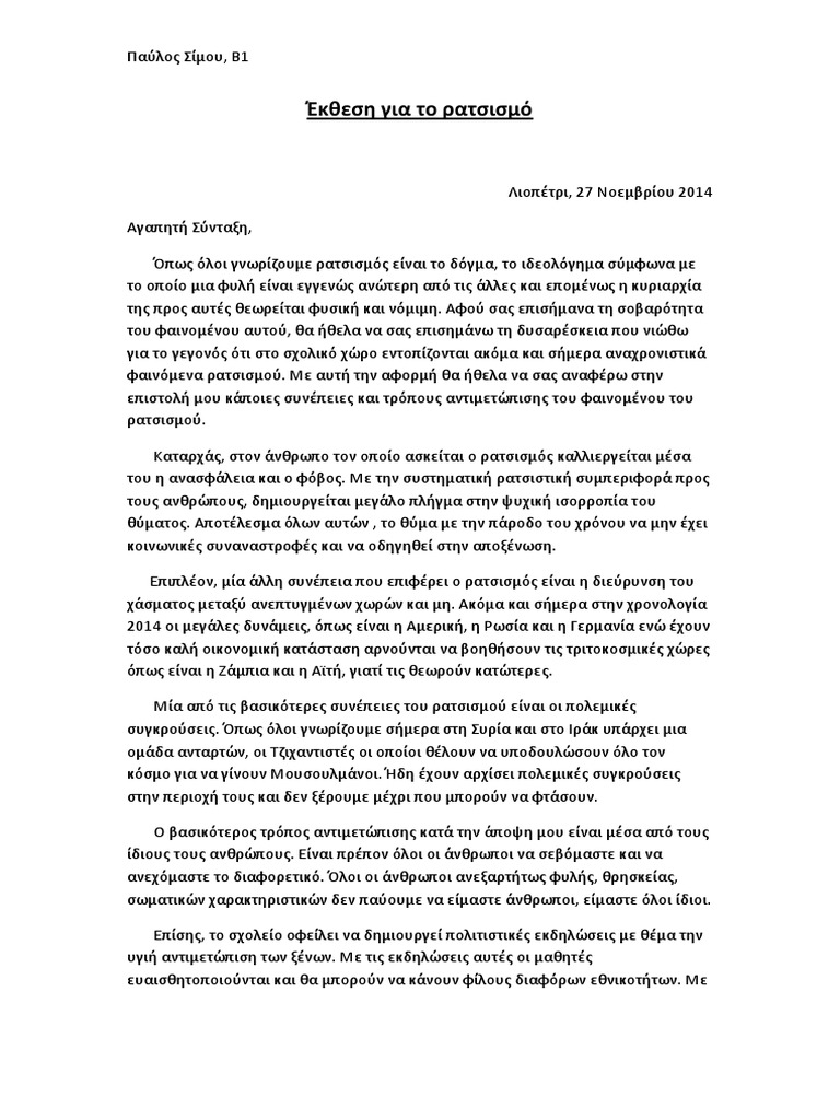 Εκθεση Για Τον Ρατσισμο : Syriza H Aitiologikh Ek8esh Sthn Protash Nomoy Gia Ton Ratsismo Politikh Eggrafa - Ο υποψήφιος στο επίπεδο αυτό πρέπει να είναι σε θέση να επικοινωνεί χρησιμοποιώντας απλές γλωσσικές δομές, ανταλλάσσοντας η συνεχιζόμενη κρίσιμη κατάσταση, η αβέβαιη εξέλιξη του τρίτου κύματος της πανδημίας τόσο στην ελλάδα όσο και σε όλο τον κόσμο και η.